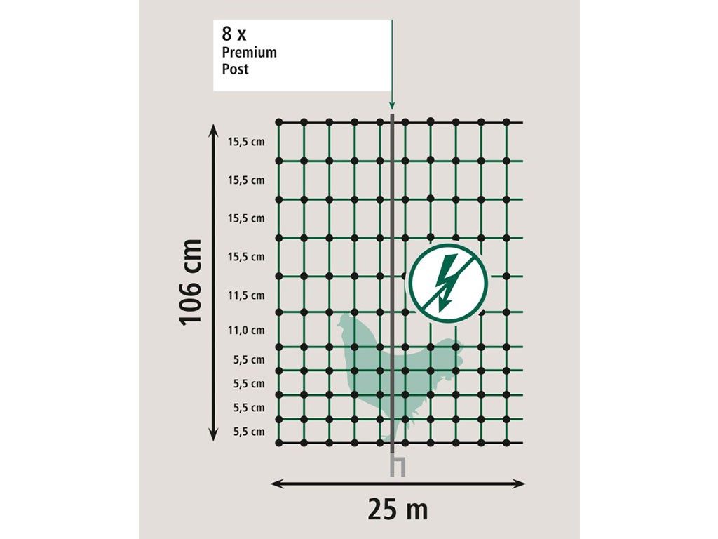 Ohradníková nevodivá síť pro drůbež, 8 PREMIUM sklolaminátových tyček, 4 kotvící háky, dvojitý pozink. hrot, menší velikost ok ve spodní části, výška 106 cm a délka 25 m.
