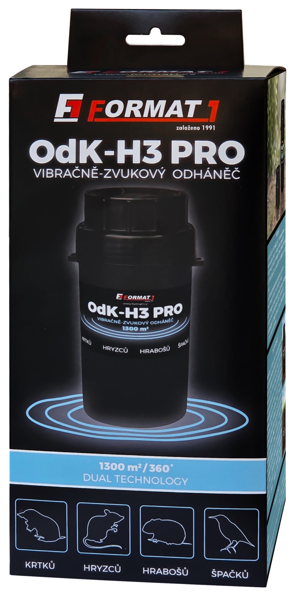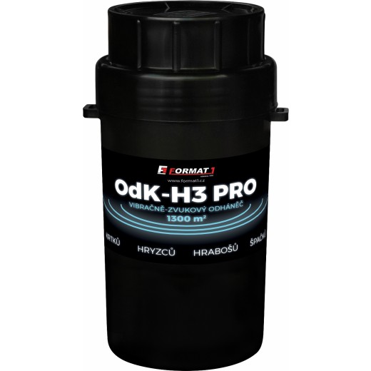 Nekompromisní řešení pro vaši zahradu. Model OdK-H3 PRO představuje vrcholnou řadu plašičů od ryze české rodinné firmy FORMAT1 (tradiční výrobce již od r. 1991). Oproti standardním modelům kombinuje dvě nejúčinnější metody odpuzování: akustické vlny a mechanické vibrace.
