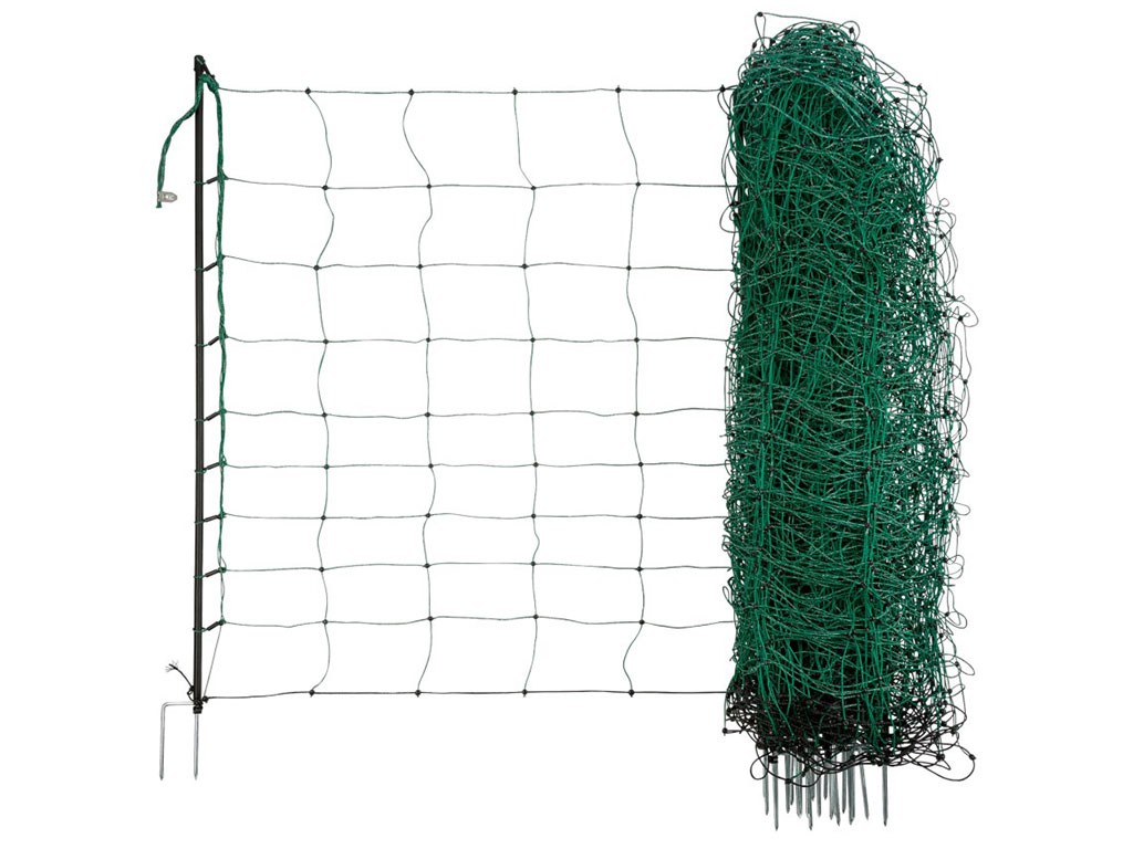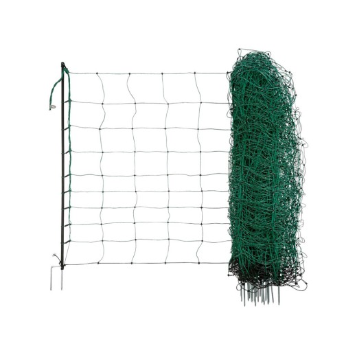 Ohradníková vodivá síť pro ovce, pro konstrukci elektrického ohradníku, 9 vodorovných pramenů, zesílený horní pramen až s 6 vodiči, spodní pramen bez vodiče, ostatní vodorovné prameny se 3 vodiči, 14 plastových tyček s dvojitým hrotem, pevně svařené spoje a odolné zarážky, výška 90 cm a délka 50 m.