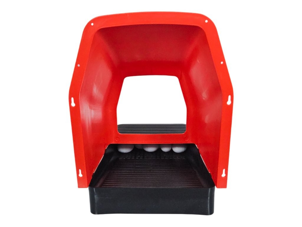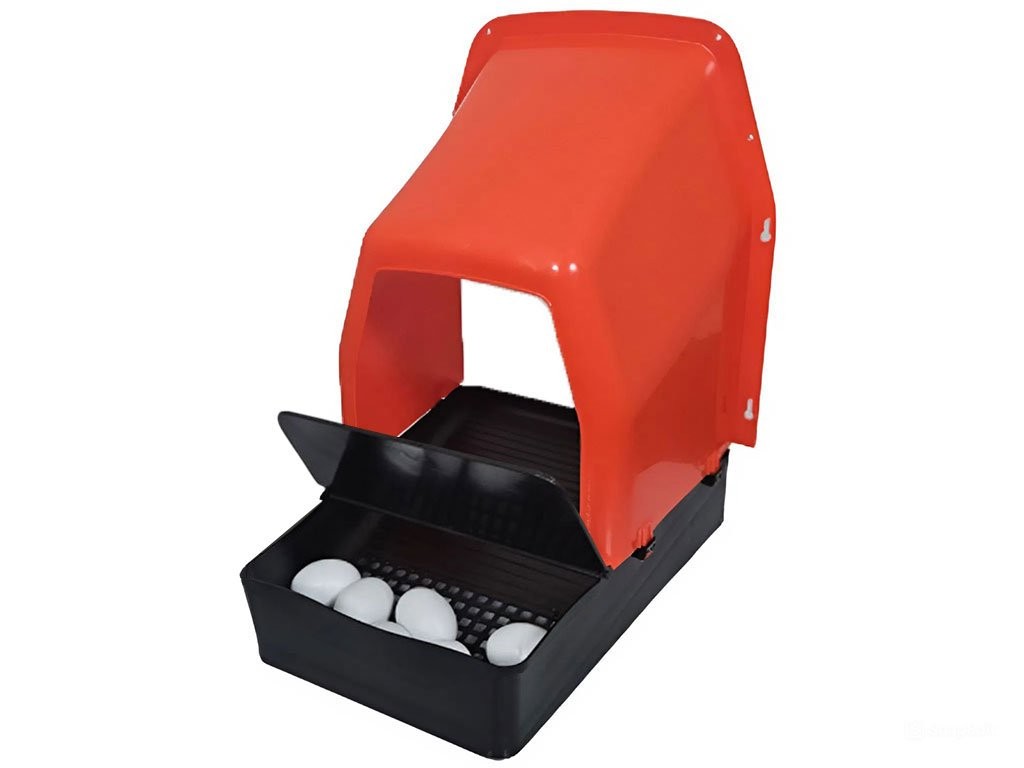 Snáškové hnízdo pro slepice se sběrným košíkem na vejce, kapacita až pro 5 nosnic na jednu kukaň, dno hnízda je spádované, vejce se samo odkutálí do košíku s kapacitou až na 10 vajec, vyrobené z plastu, barva červená. Jednoduché připevnění na zeď, velice snadná údržba čistoty, rozměry 36cm délka x 42cm šířka x 41cm výška.