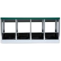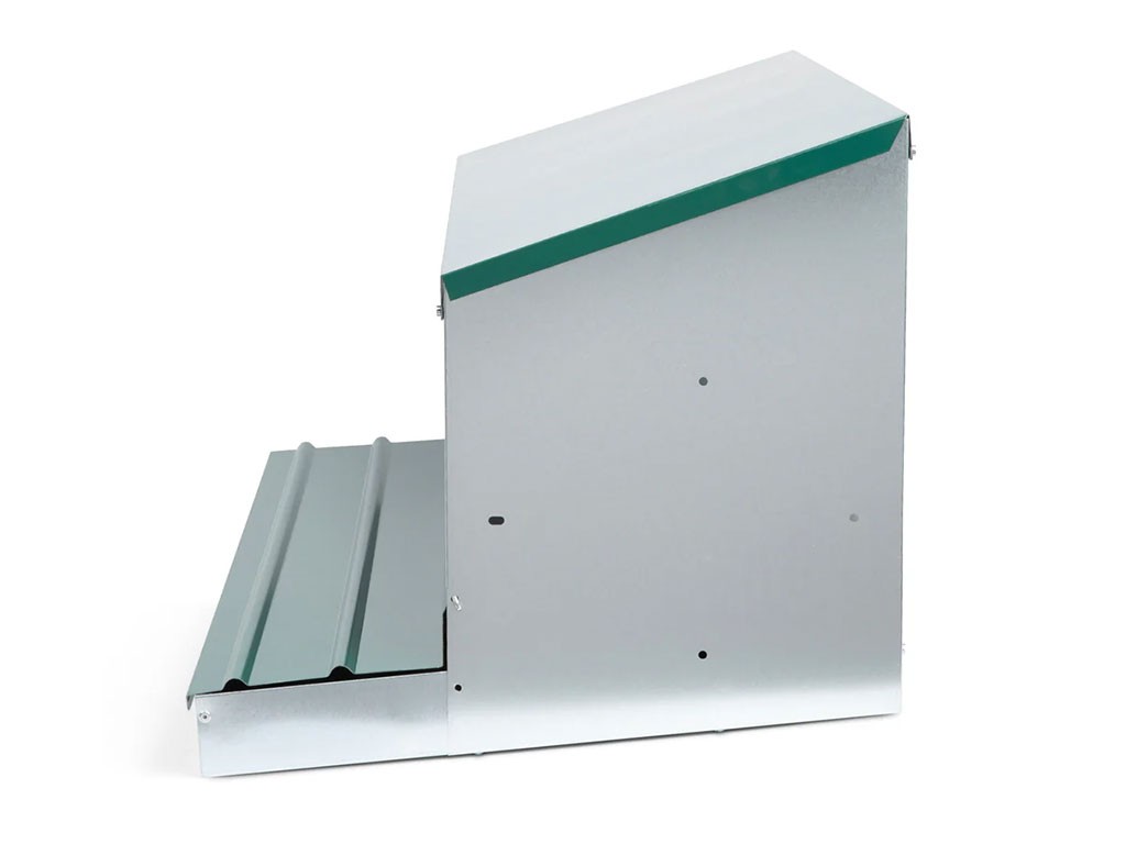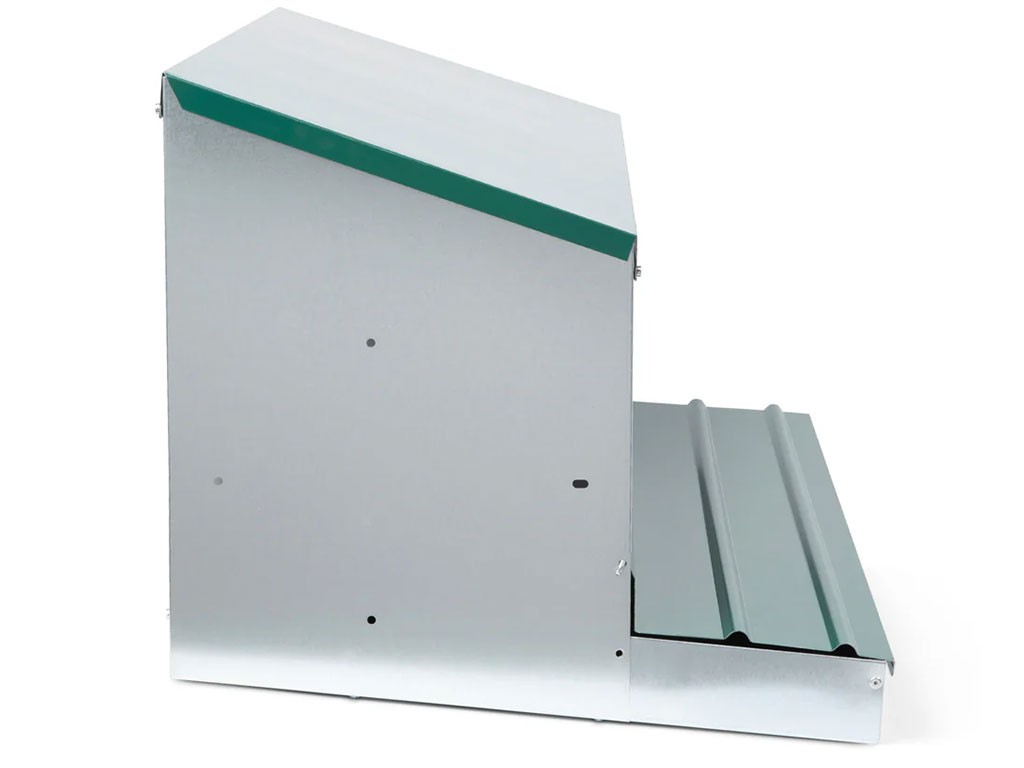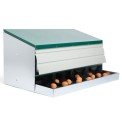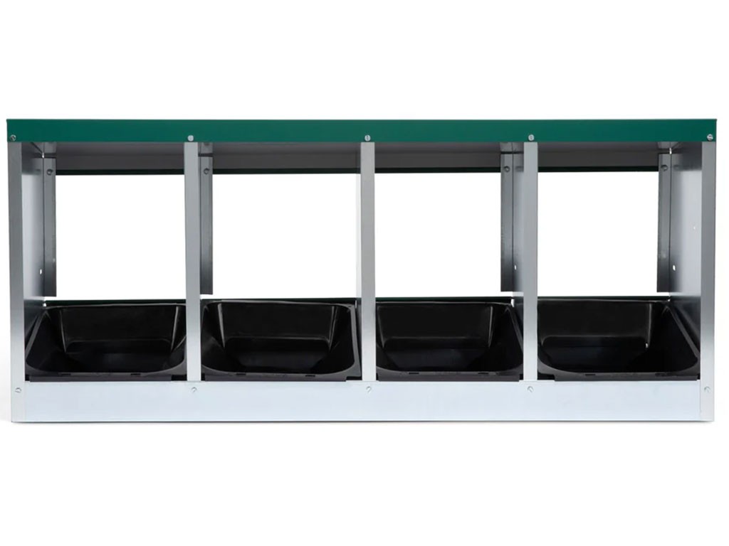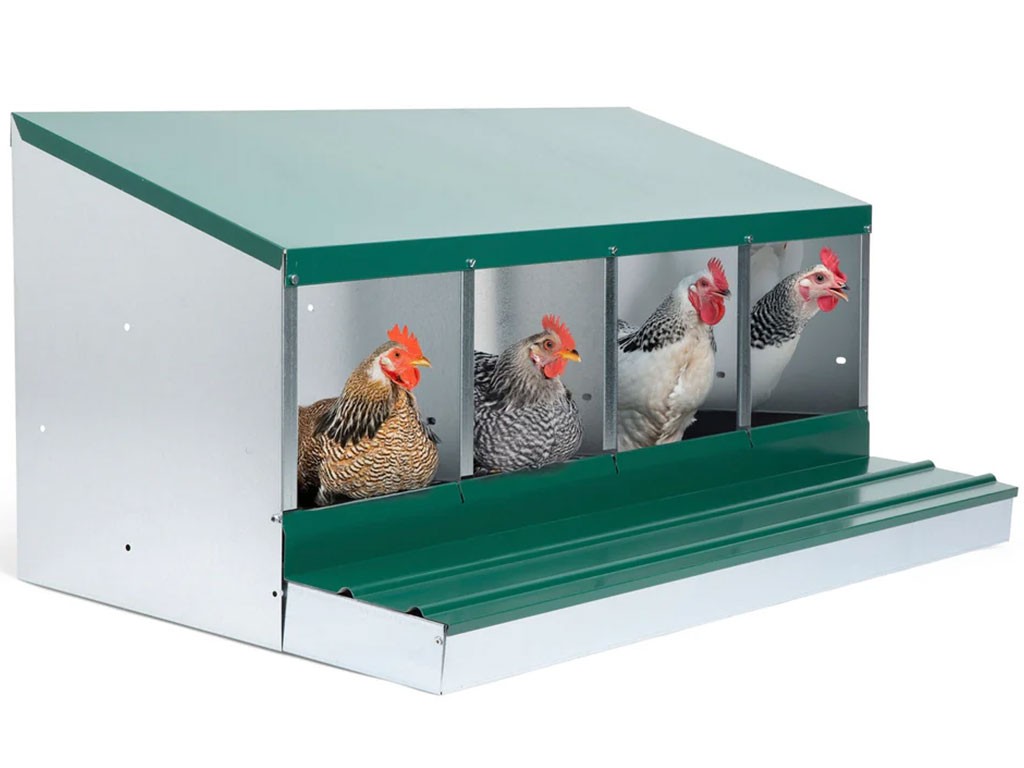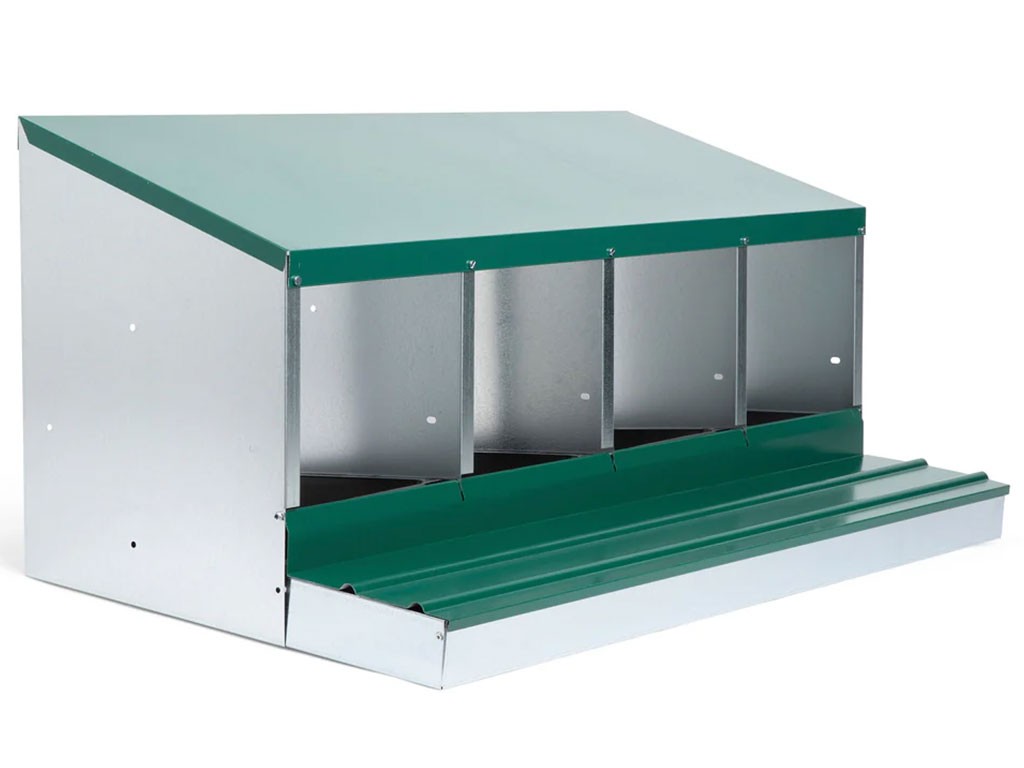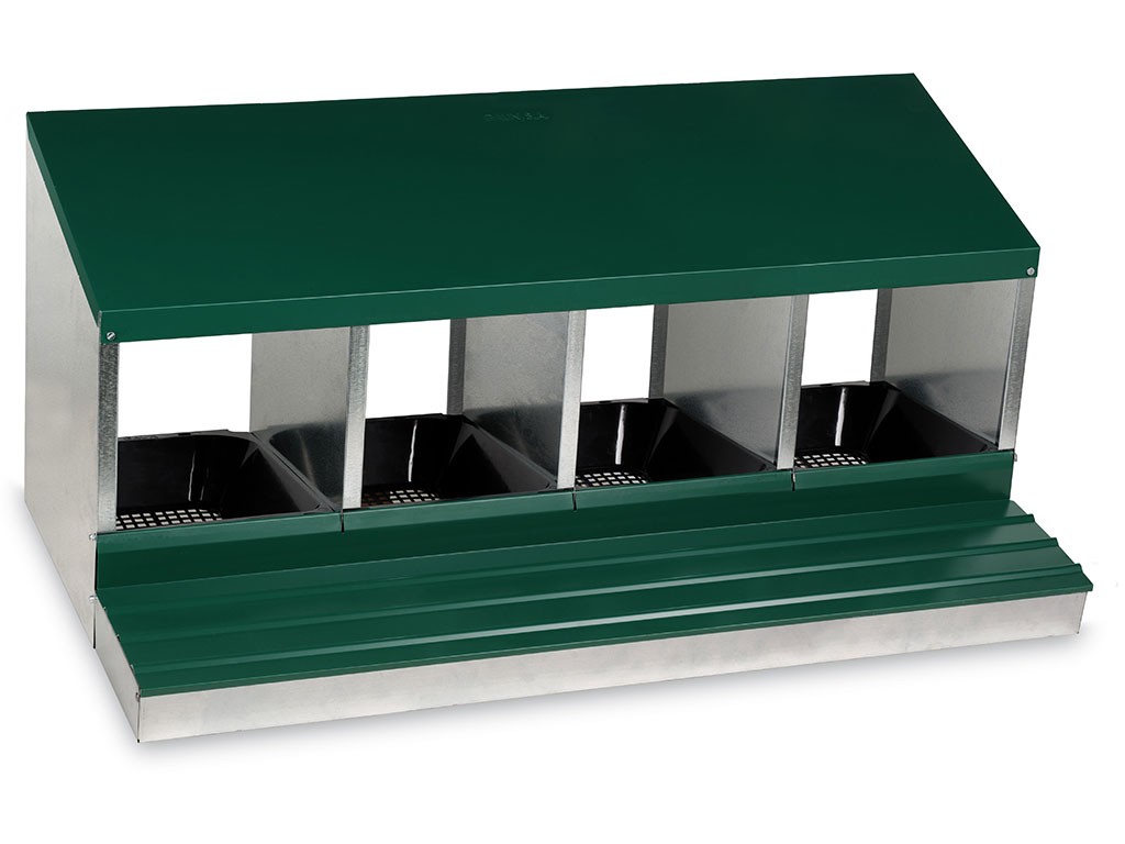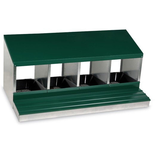 Snáškové hnízdo pro slepice se sběrným košíkem na vejce čtyřmístné, kapacita až 20 nosnic (5 nosnic na jednu kukaň), dno hnízda je spádované, vejce se samo odkutálí do sběrného košíku, vyrobené z pozinkovaného kovu, barva zelená. Hnízdo můžete jednoduše postavit v kurníku na zem nebo zavěsit na zeď, velice snadná údržba čistoty, rozměry: 56 cm délka x 106,3 cm šířka x 45,5 cm výška.