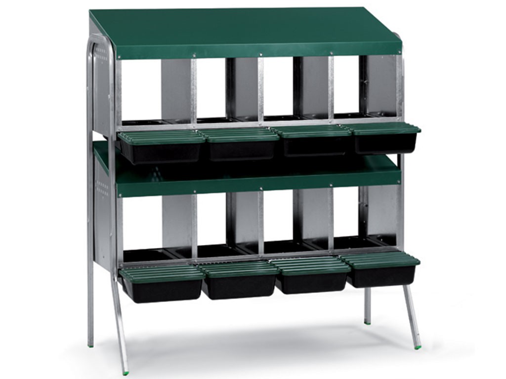 Snáškové hnízdo pro slepice se sběrným košíkem na vejce 8-místné na nožičkách, kapacita až 40 nosnic (5 nosnic na jednu kukaň), dno hnízda je spádované, vejce se samo odkutálí do sběrného košíku, vyrobené z pozinkovaného kovu s plastovým dnem, barva zelená. Hnízdo můžete jednoduše postavit v kurníku na zem, velice snadná údržba čistoty, rozměry: 52,5 cm délka x 109,1 cm šířka x 121 cm výška.