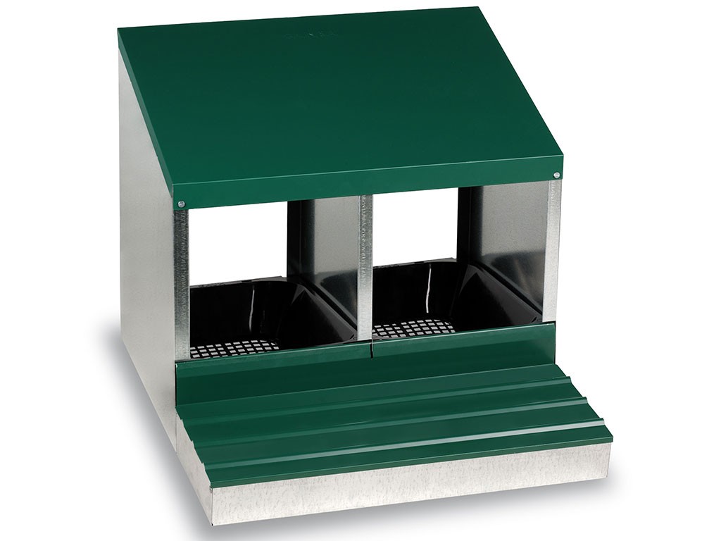 Snáškové hnízdo pro slepice se sběrným košíkem na vejce dvoumístné, kapacita až 10 nosnic (5 nosnic na jednu kukaň), dno hnízda je spádované, vejce se samo odkutálí do sběrného košíku, vyrobené z pozinkovaného kovu, barva zelená. Hnízdo můžete jednoduše postavit v kurníku na zem nebo zavěsit na zeď, velice snadná údržba čistoty, rozměry: 56 cm délka x 53,5 cm šířka x 45,5 cm výška.