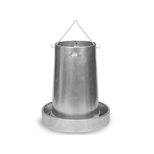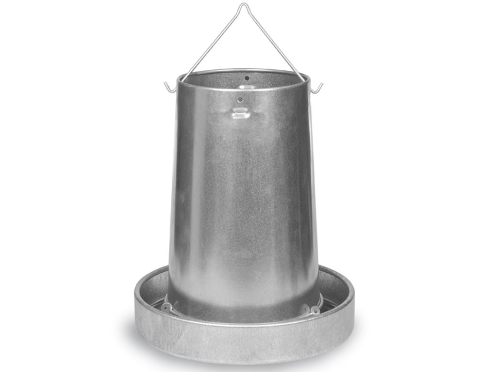 Tubusové krmítko, pro kuřata, slepice a další drůbež, pozinkované, lze zavěsit či postavit, kapacita 20 kg, průměr misky 405 mm, výška krmítka 455 mm.